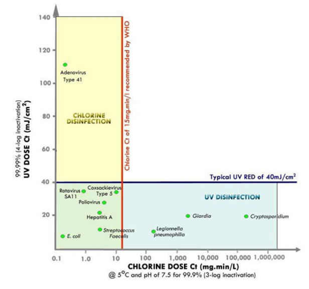 Tal como se muestra en el diagrama, la desinfección por luz UV amplía el espectro de eficacia considerablemente frente a otros virus.