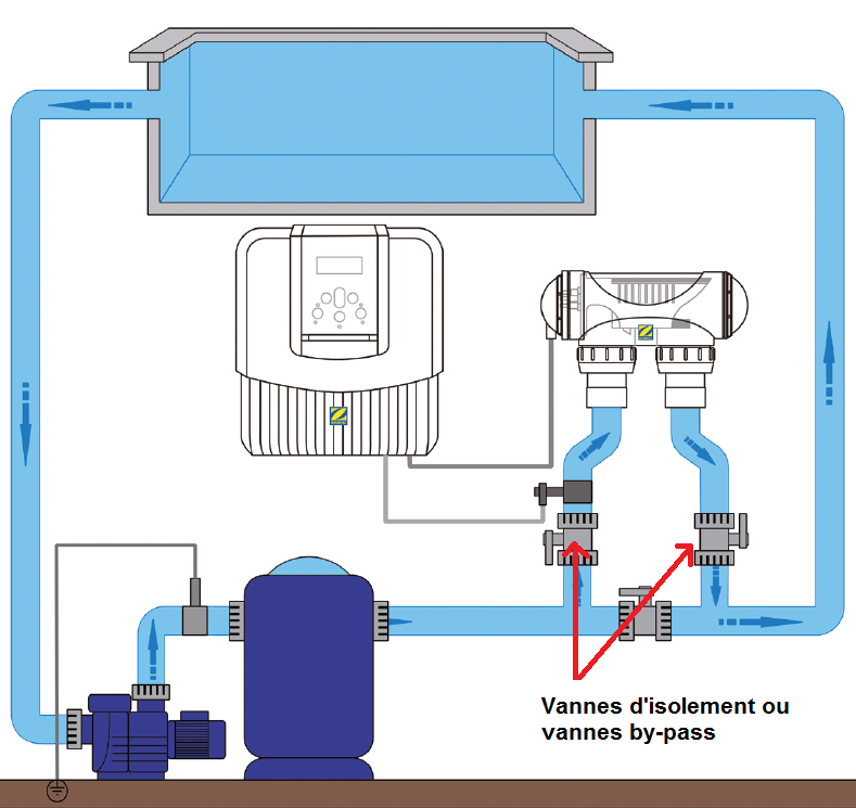 - Ouvrez à nouveau les vannes d’isolement, puis remettez la filtration et l’électrolyseur en marche.