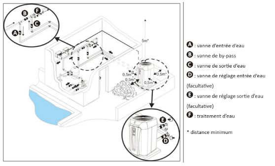 Avertissement : L’appareil doit être installé à une distance minimum de la margelle du bassin. Cette distance est déterminée par la norme électrique en vigueur dans le pays d’installation.