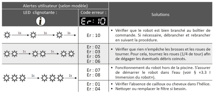 - Si les codes "Er:7" ou "Er:8" apparaissent, assurez-vous que le robot est dans l'eau avant de le démarrer.